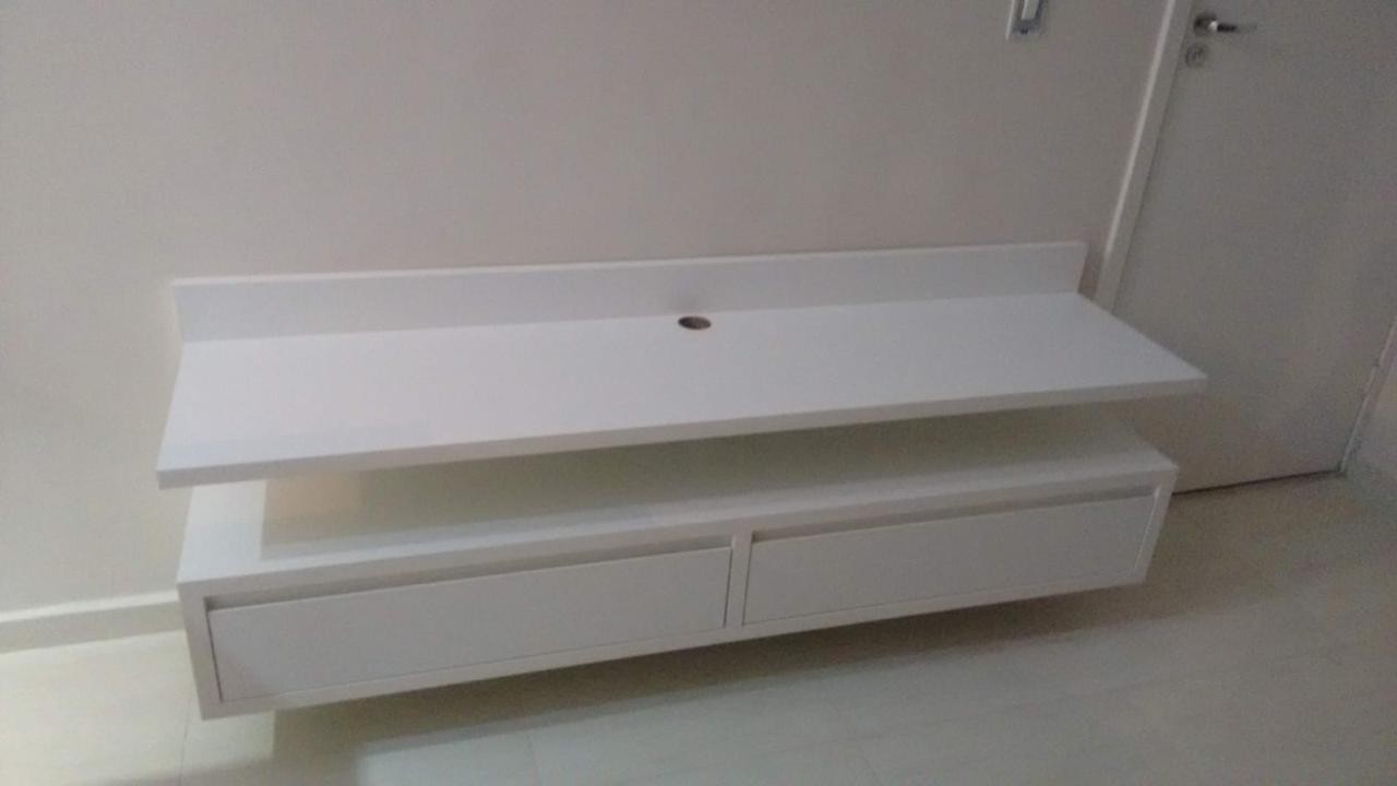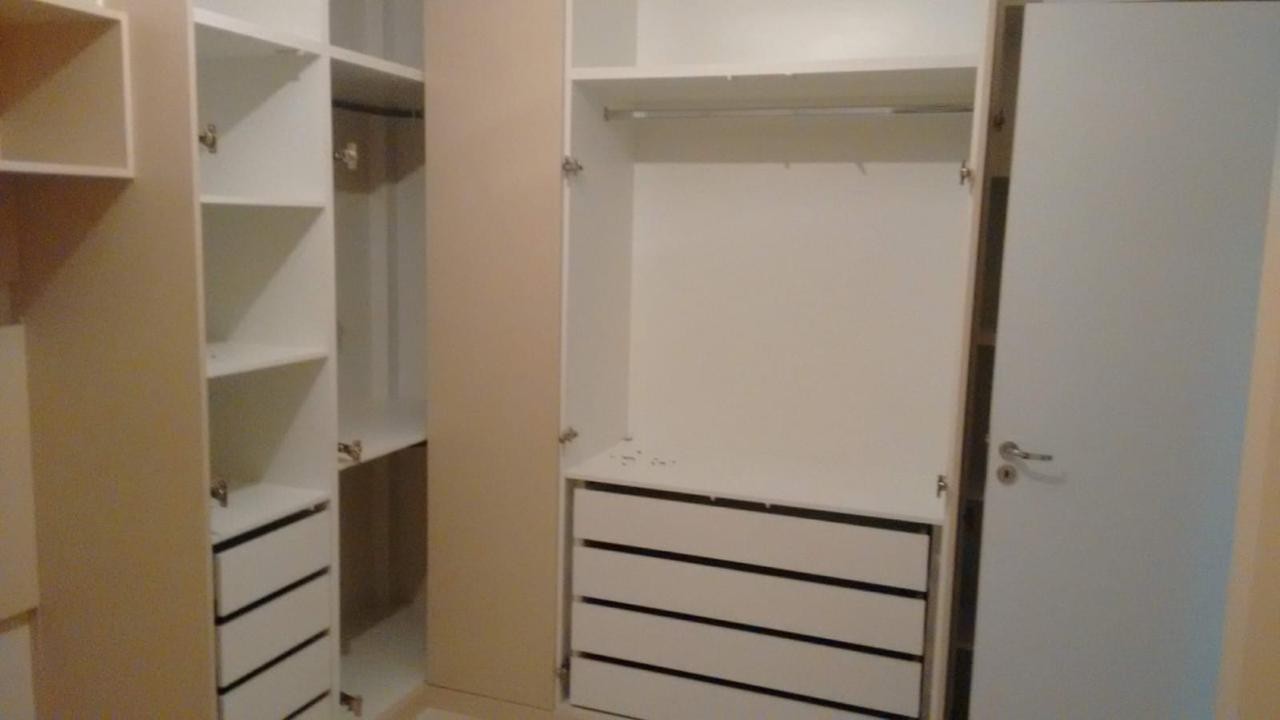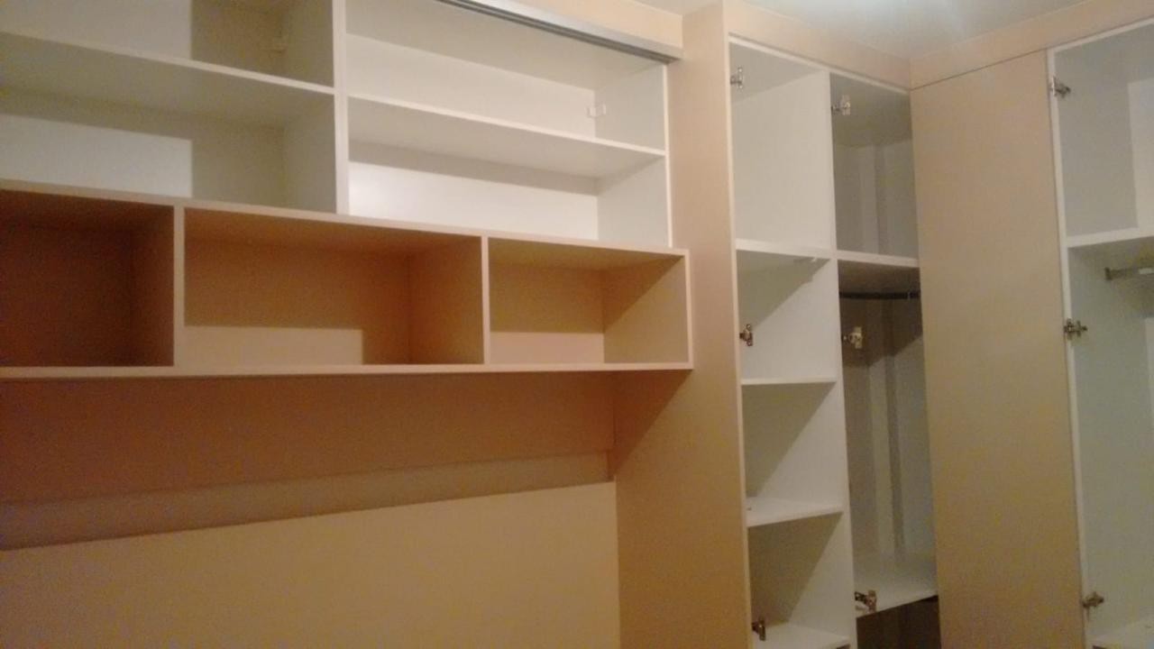 Quarto 1 com guarda roupa de canto, maleiro e sapateiro atrás da porta (postas de clic, só encostar para abrir e fechar) painel para TV e um armário de canto de cama com duas gavetas.
