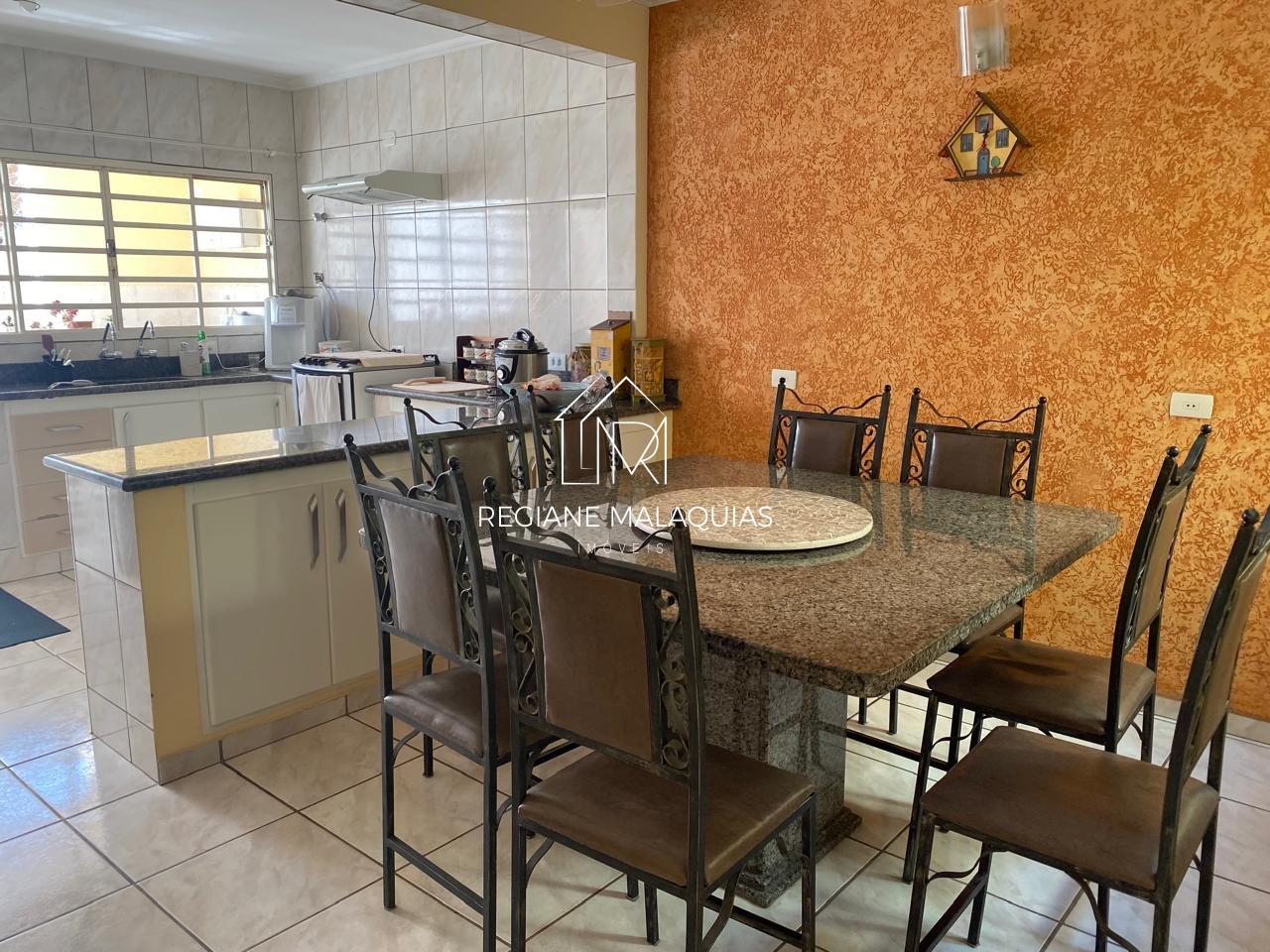 Térreo- garagem para dois carros, com portão eletrônico e câmera; escritório equipado com armário; banheiro; área luz; sala de jantar integrada a cozinha, equipada com armários planejados e uma mesa em granito para 8 pessoas; lavanderia com armário planejado; amplo quintal com churrasqueira, pia, piscina e um canil.